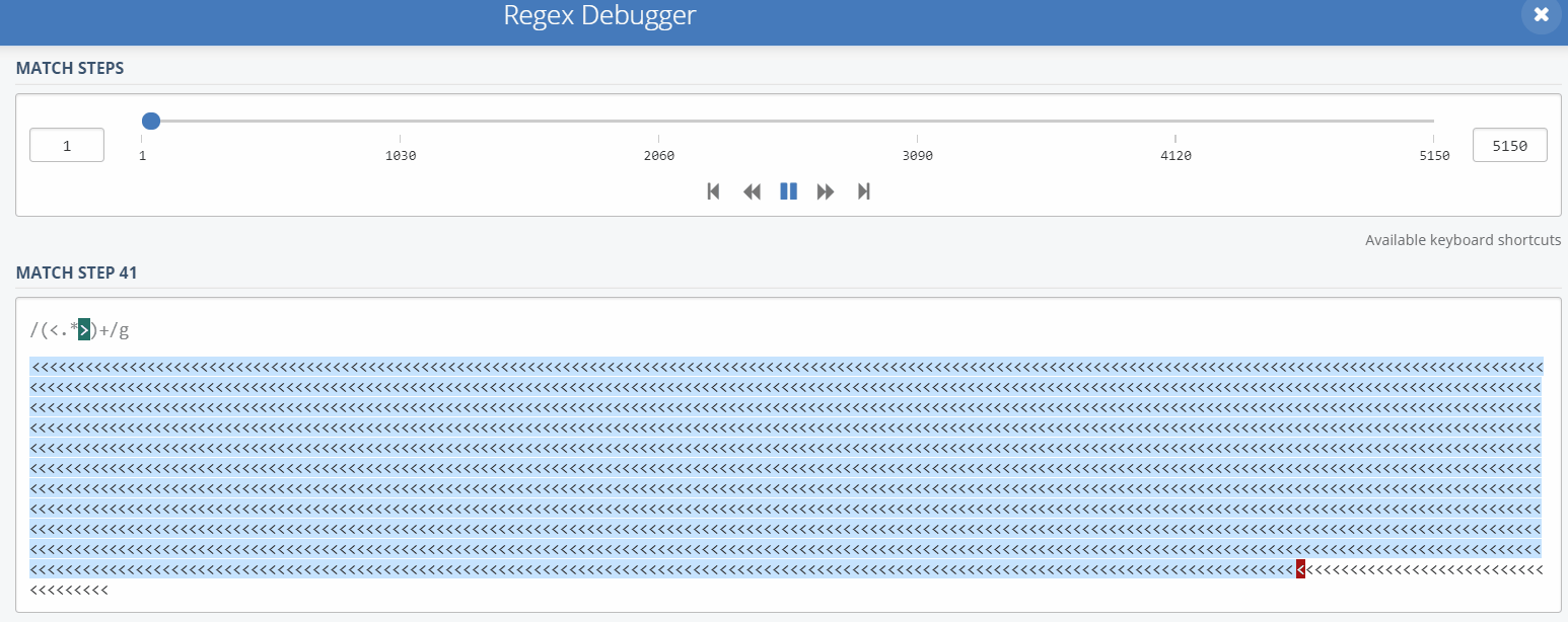 分组内贪婪匹配任意字符,也就可以构造分组内无限长但是分组不匹配的字符串,从而导致在搜索过程中,不停的回溯,匹配次数指数级增长。匹配过程如下: