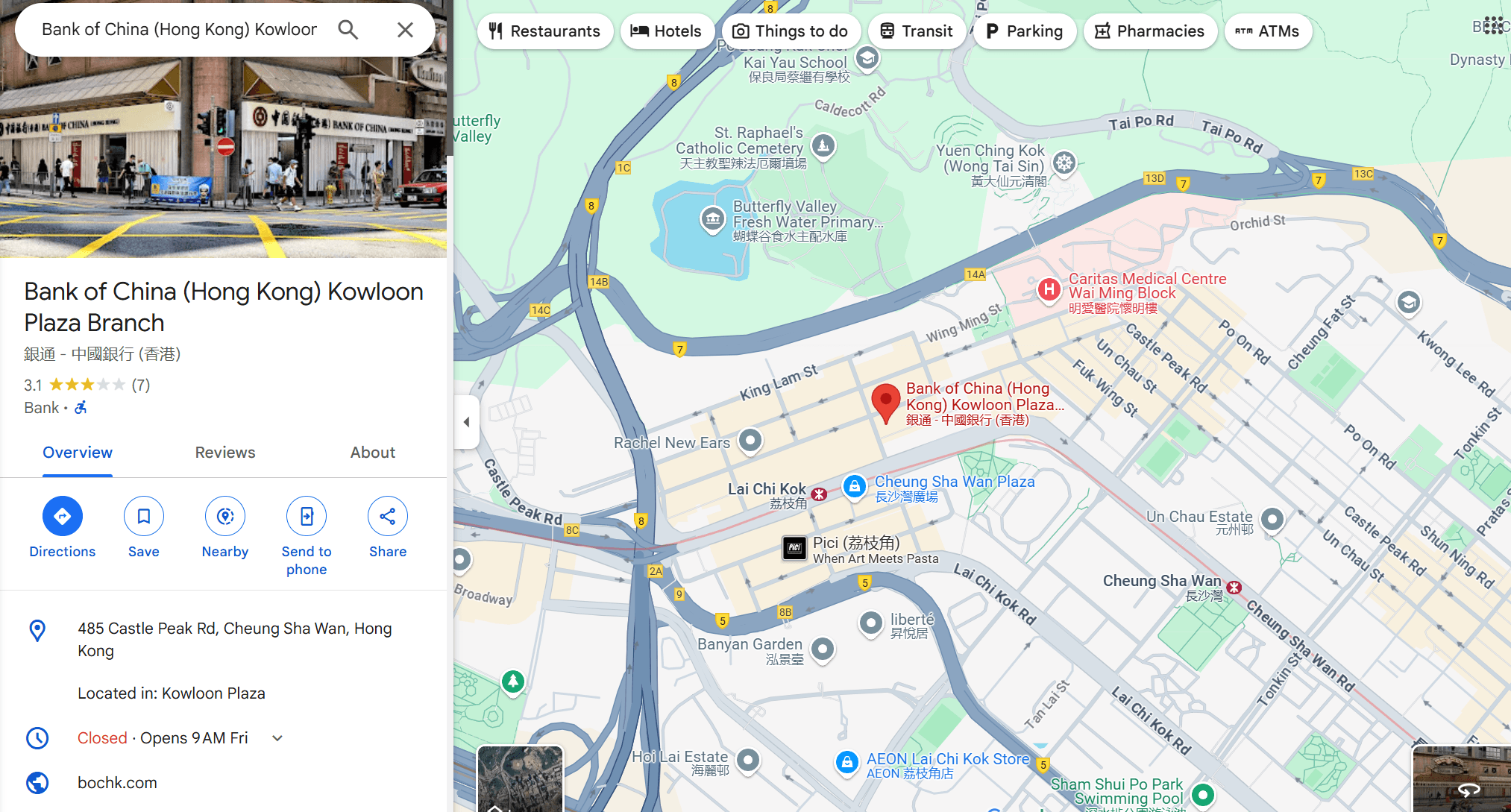 其实深水埗地铁站附近,汇丰、工银亚洲、中银香港三家银行都有,如果能都约到这里,那会非常的方便。(PS:不要使用高德,什么地方都搜不到,老老实实Google Map好吗?)